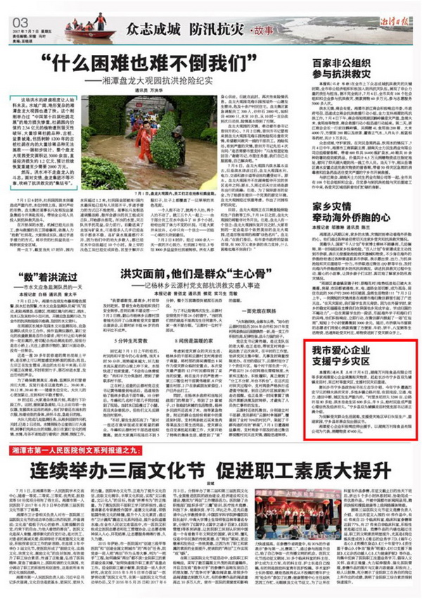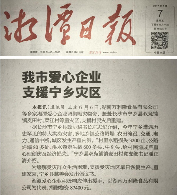 湘潭日報 2017年7月7日3版 刊登了湖南萬利隆食品有限公司支援寧鄉(xiāng)災區(qū)的報道
