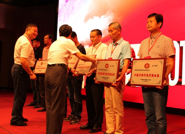 總經(jīng)理韓廣寧先生(右三)代表公司接受2017中國(guó)月餅文化節(jié)“中國(guó)月餅行業(yè)百?gòu)?qiáng)企業(yè)”榮譽(yù)